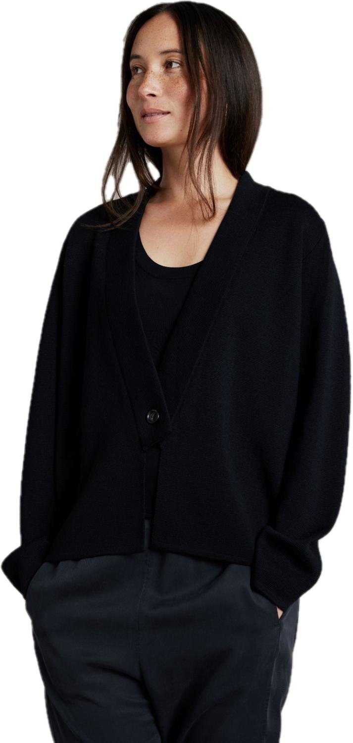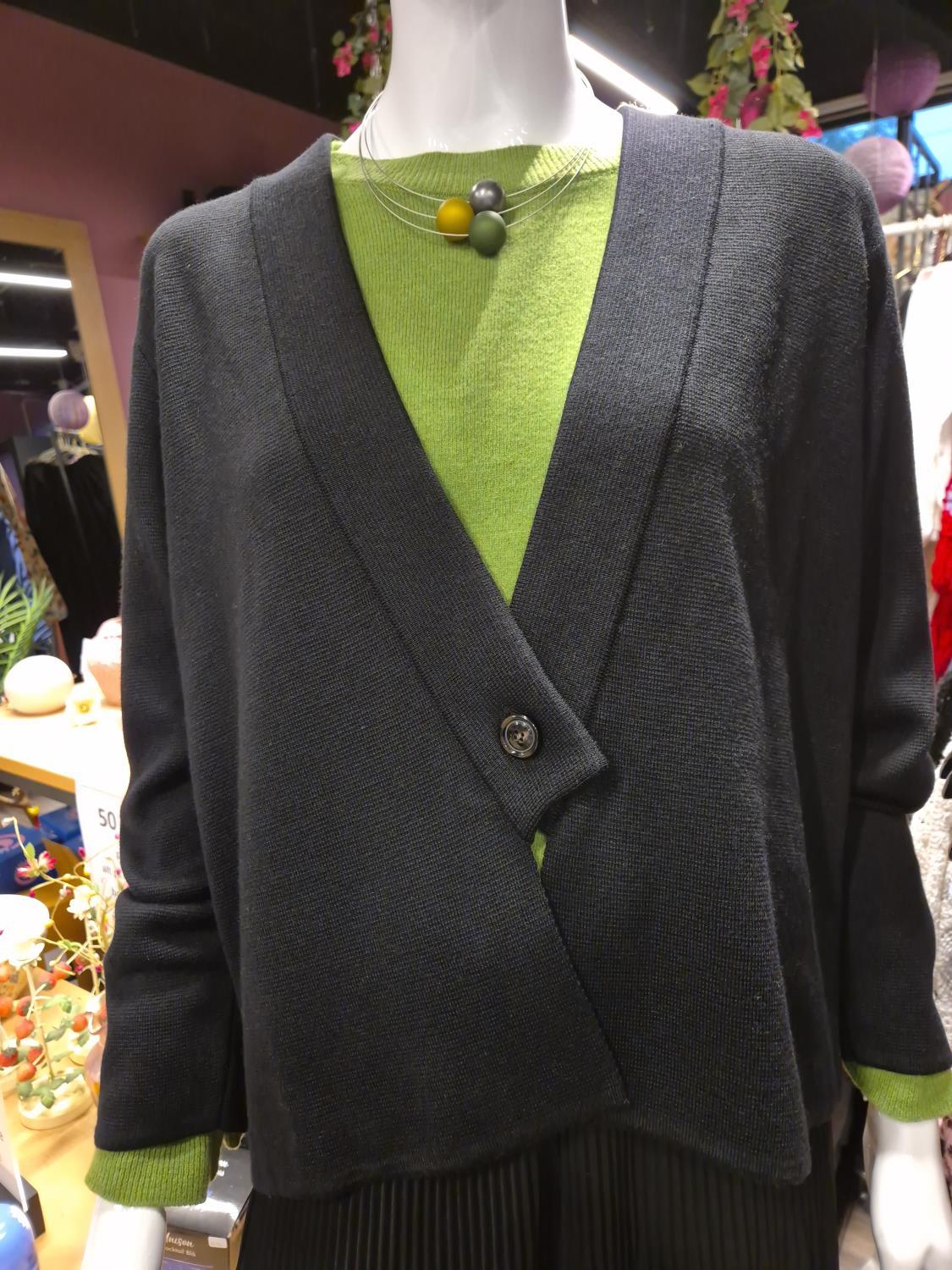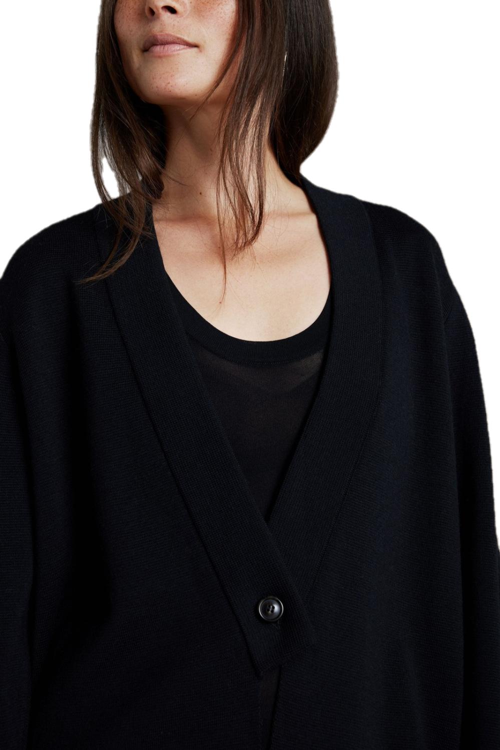 Lekker jakke i nydelig finstrikk. Tøff detalj foran hvor jakkeslag skrår mot knepping, en stor knapp til lukking.