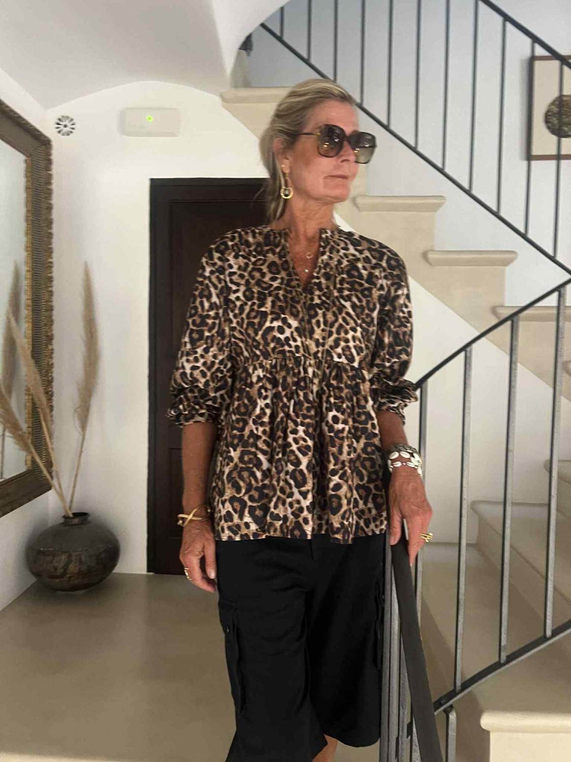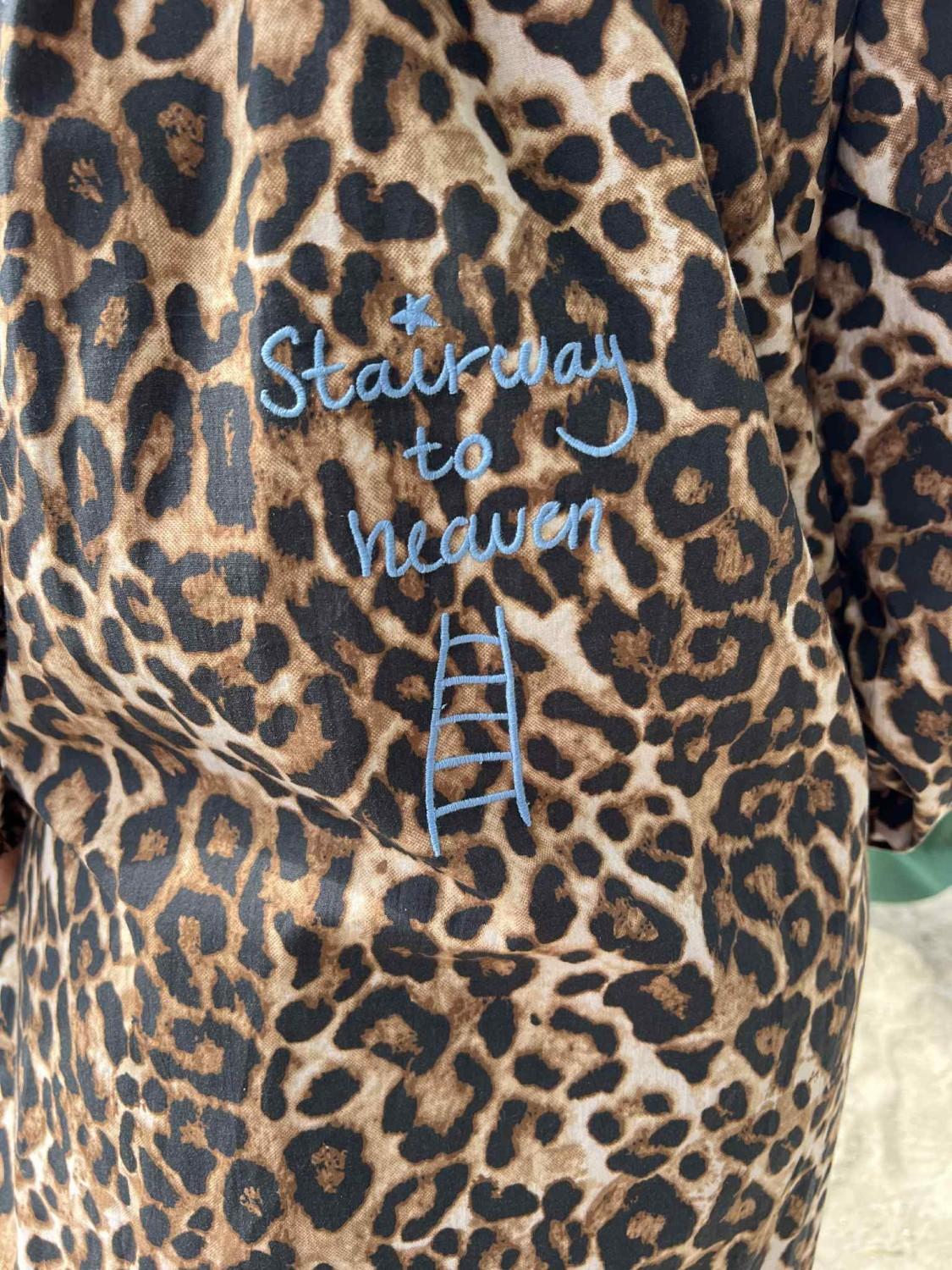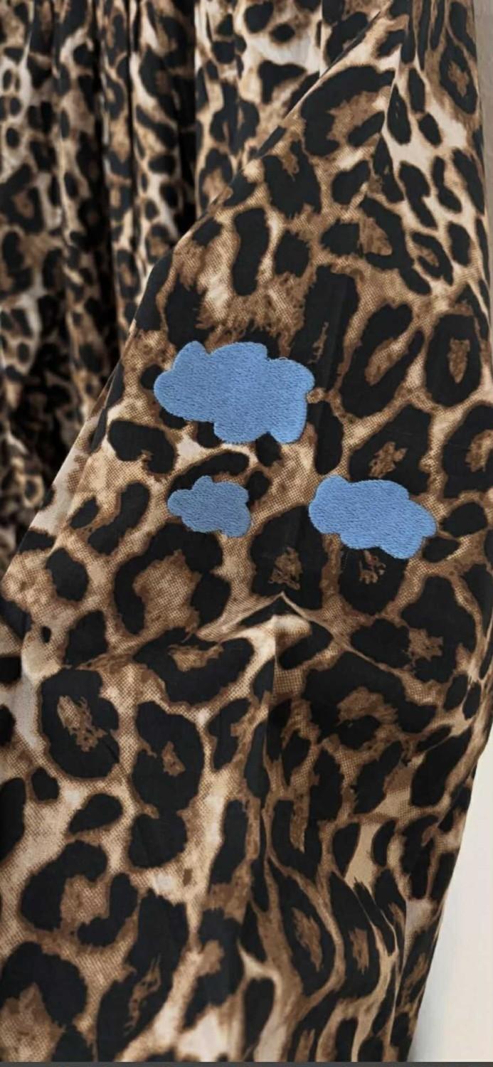 Denne blusen i leo-mønster med lyseblå broderier er så tøff!