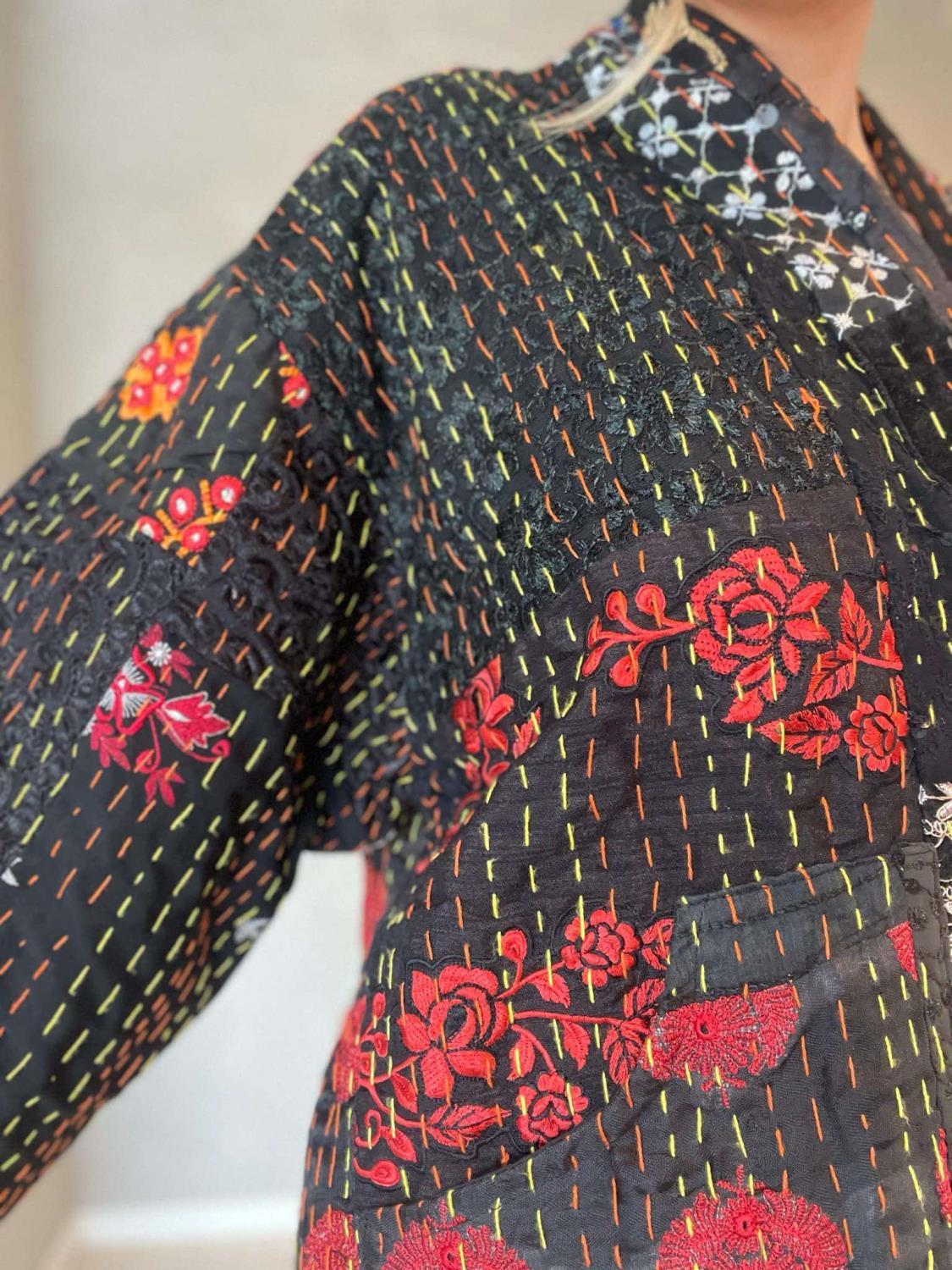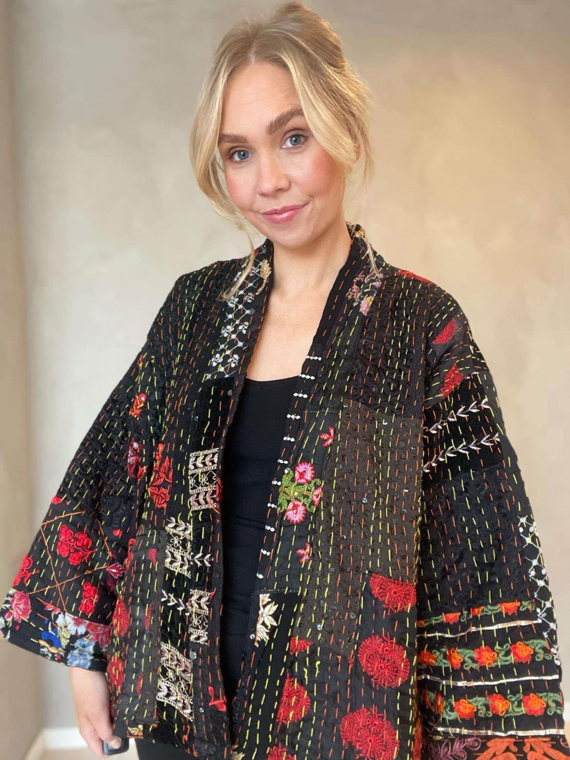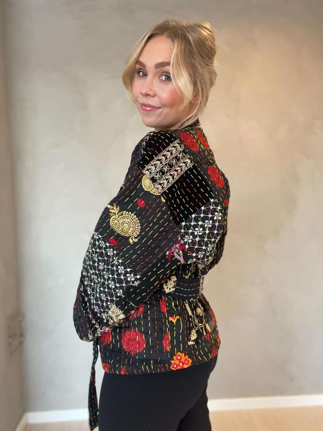 Den vakreste quiltede jakke fra vårt nye og unike merke Wauw. Jakken er åpen uten knapper, men har med et løst belte. Den har 2 påsydde lommer. Ermene er 3/4 lange. Jakka har de vakreste broderier, og den er er unik da ingen er like. Hver jakke er sydd sammen av vakre indiske stoffer.
