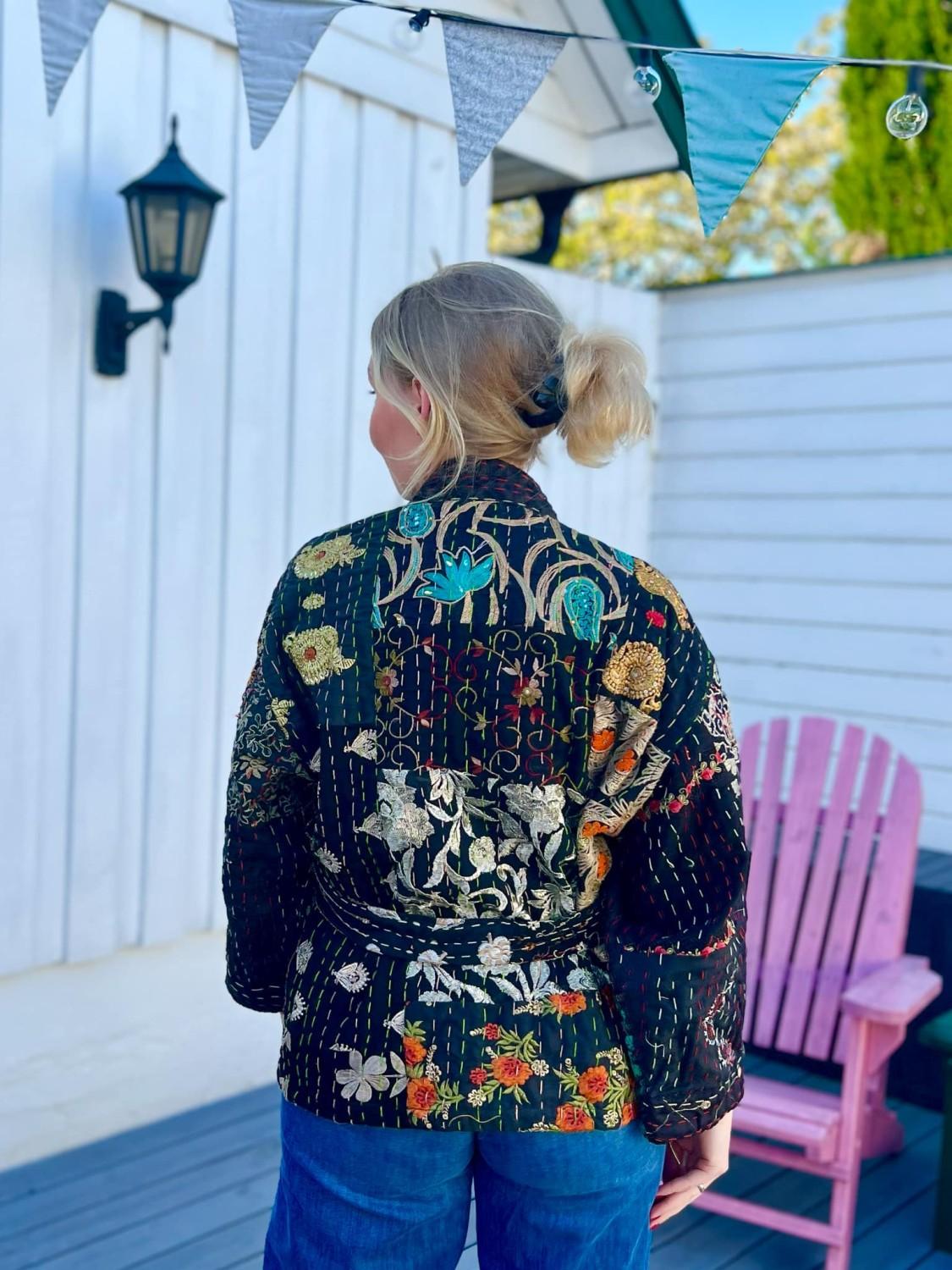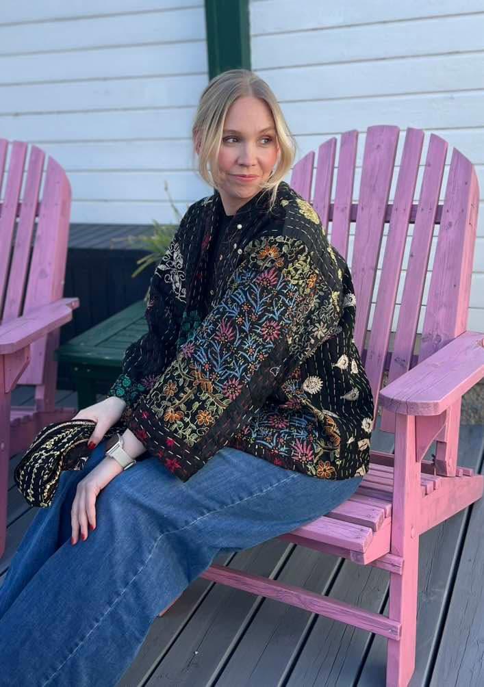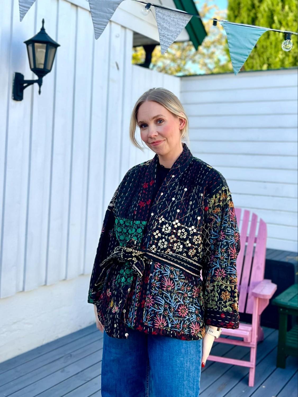 Den vakreste quiltede jakke fra vårt nye og unike merke Wauw. Jakken er åpen uten knapper, men har med et løst belte. Den har 2 påsydde lommer. Ermene er 3/4 lange. Jakka har de vakreste broderier, og den er er unik da ingen er like. Hver jakke er sydd sammen av vakre indiske stoffer.