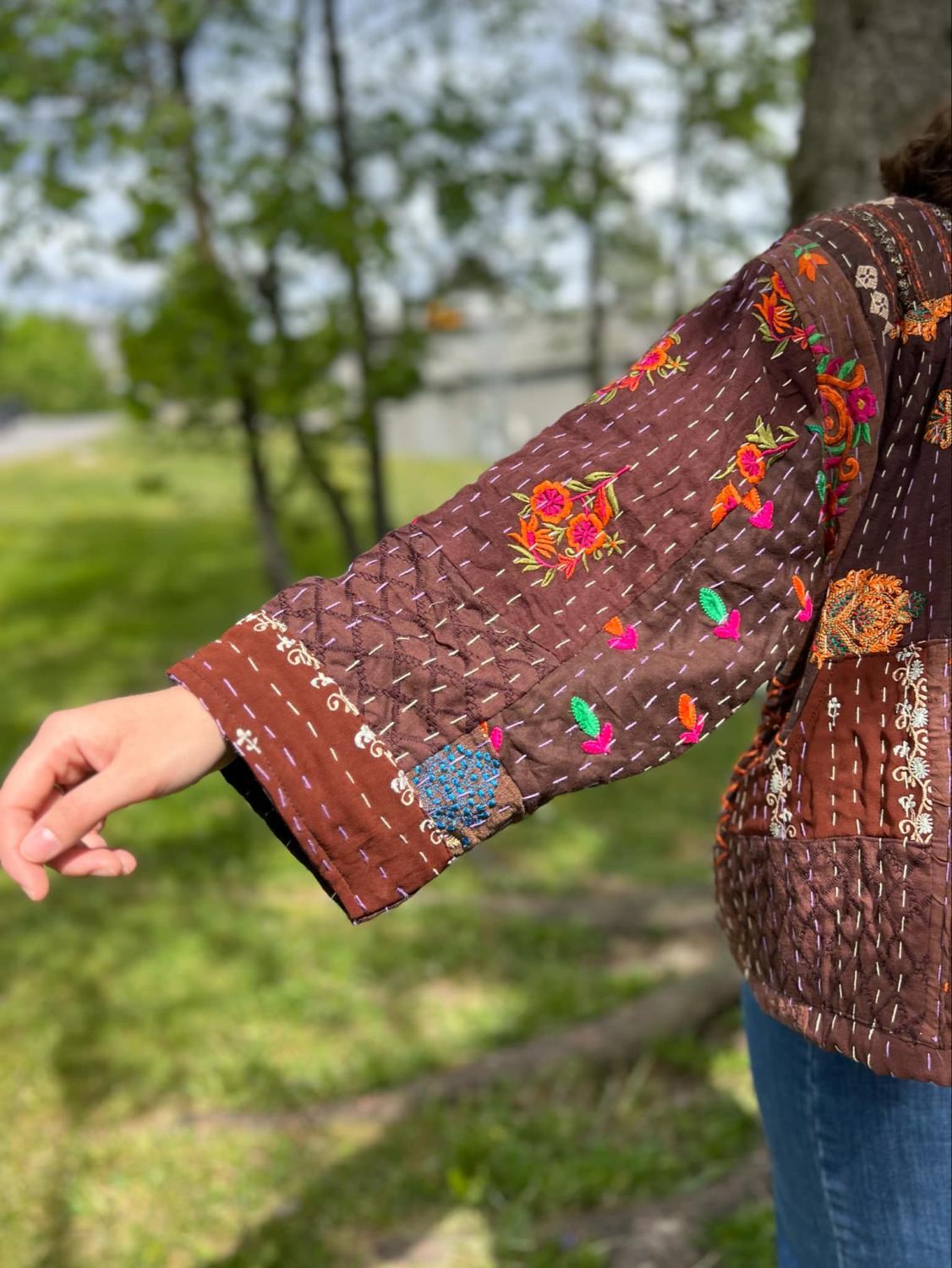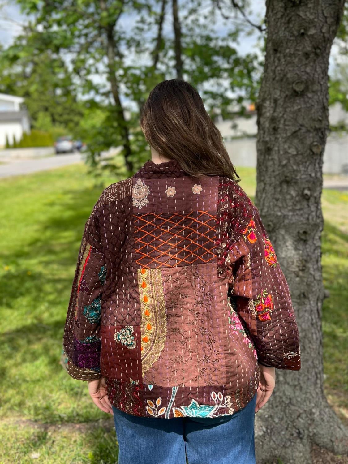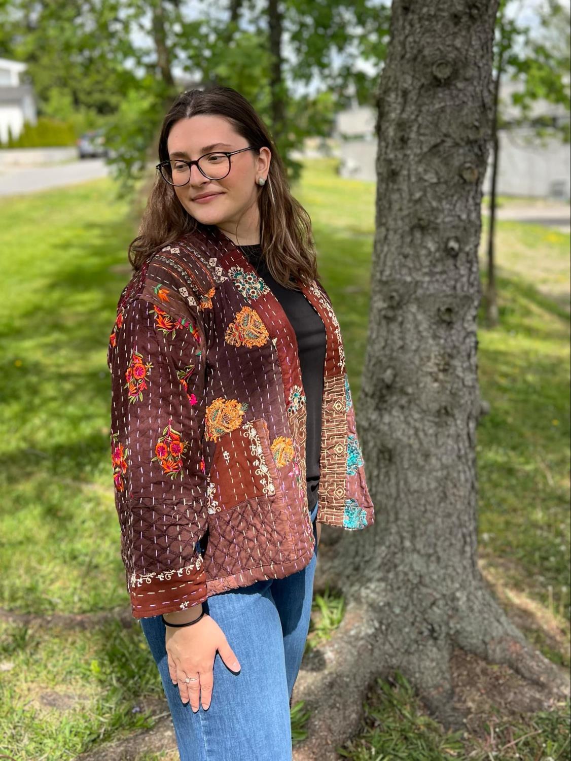 Den vakreste quiltede jakke fra vårt nye og unike merke Wauw. Jakken er åpen uten knapper, men har med et løst belte. Den har 2 påsydde lommer. Ermene er 3/4 lange. Jakka har de vakreste broderier, og den er er unik da ingen er like. Hver jakke er sydd sammen av vakre indiske stoffer.