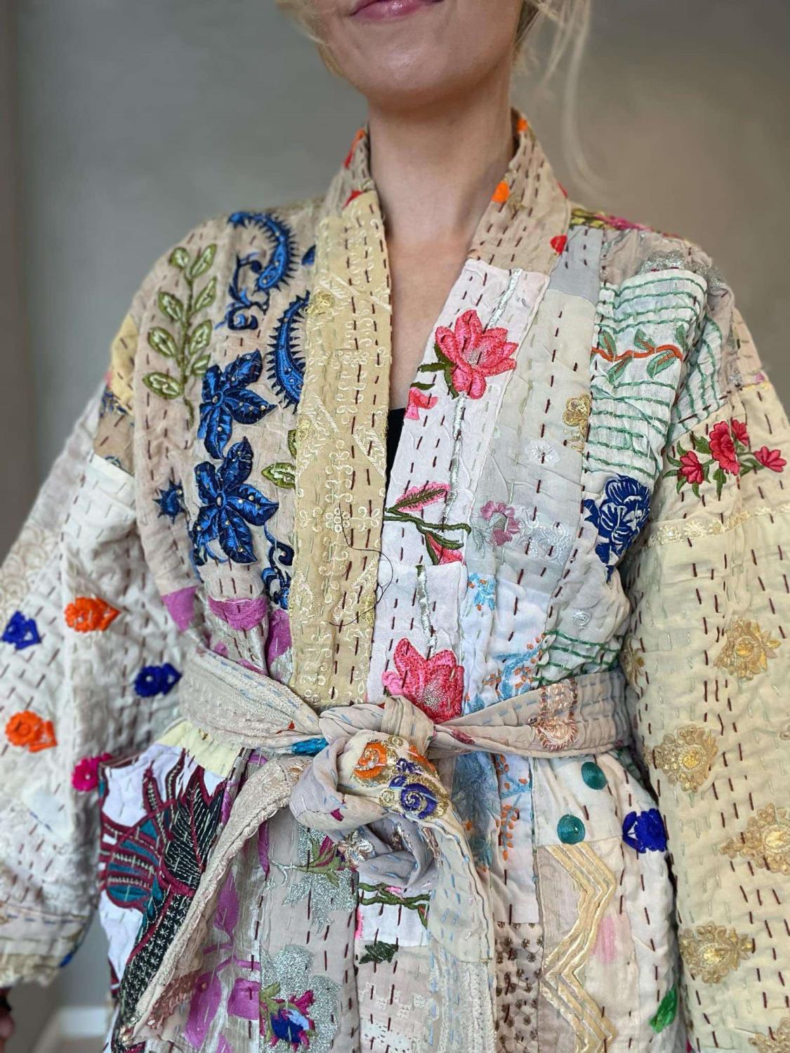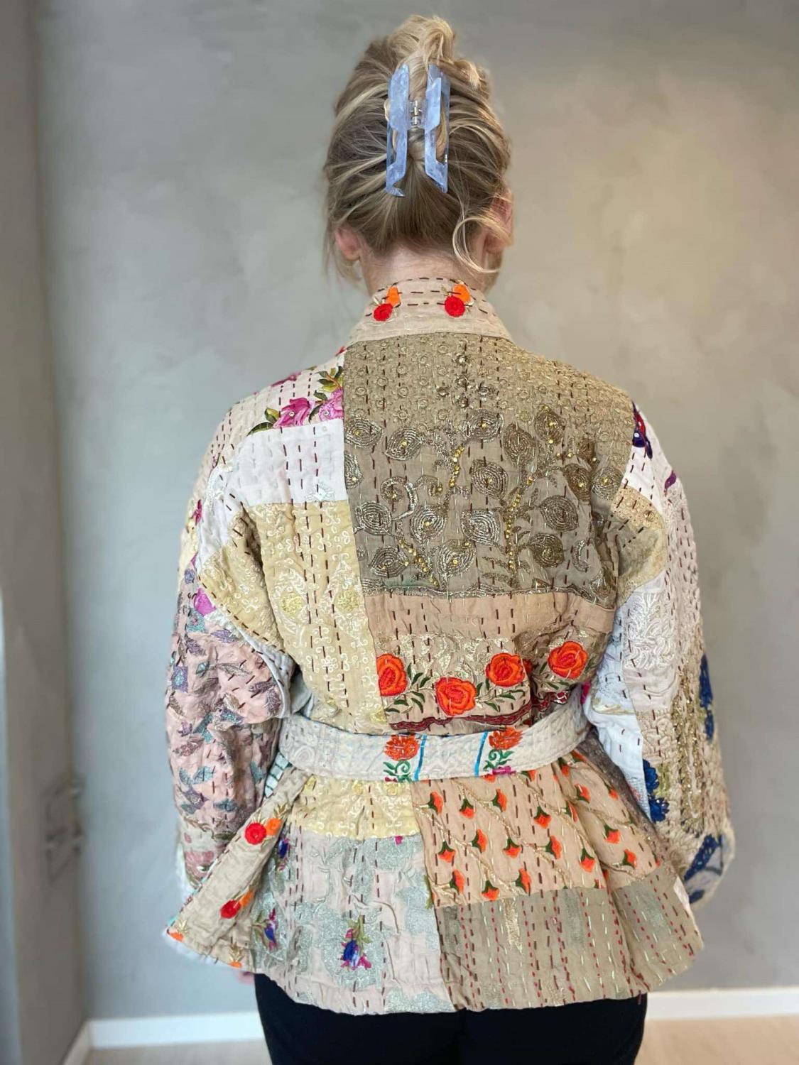Den vakreste quiltede jakke fra vårt nye og unike merke Wauw. Jakken er åpen uten knapper, men har med et løst belte. Den har 2 påsydde lommer. Ermene er 3/4 lange. Jakka har de vakreste broderier, og den er er unik da ingen er like. Hver jakke er sydd sammen av vakre indiske stoffer.