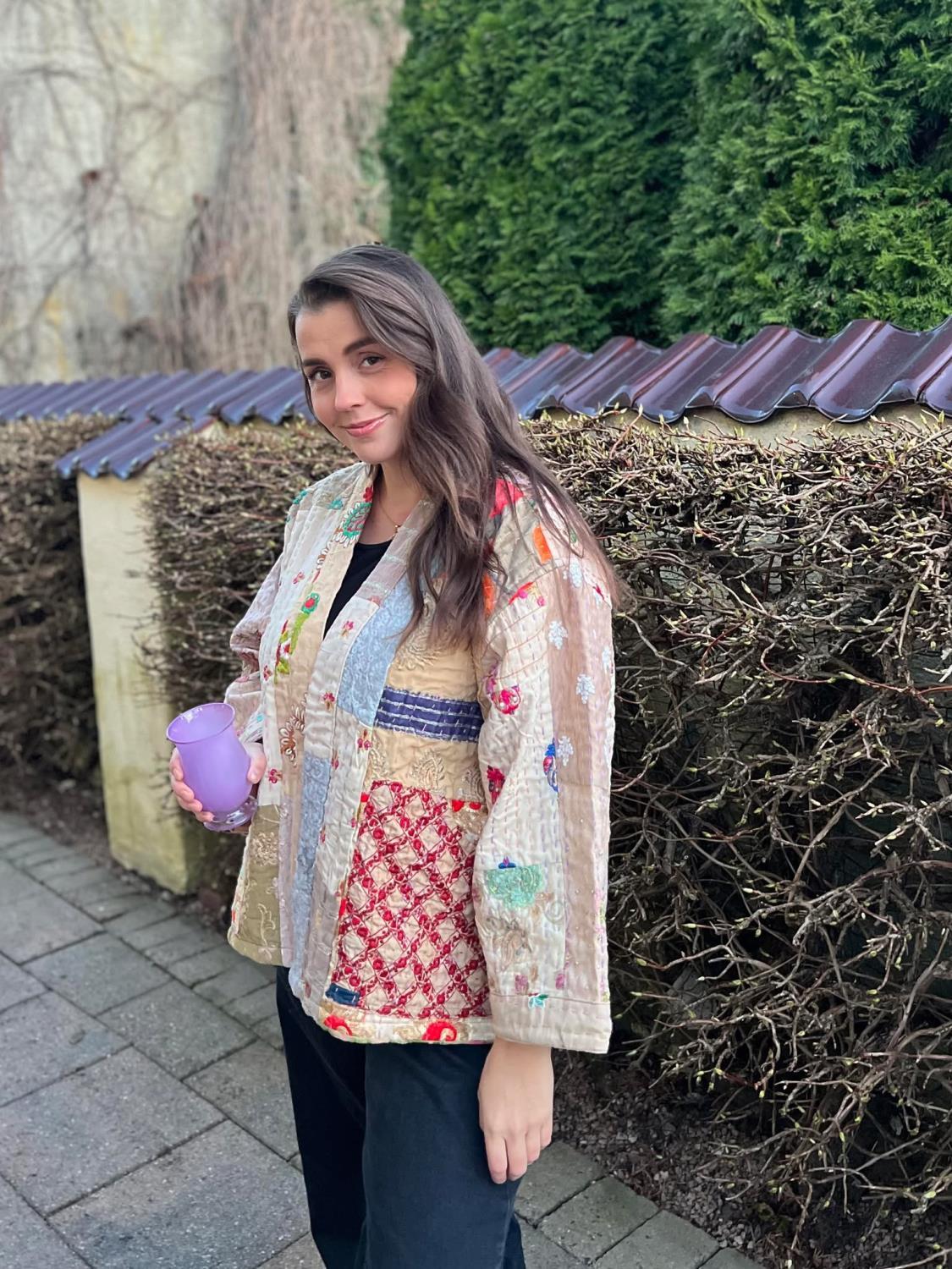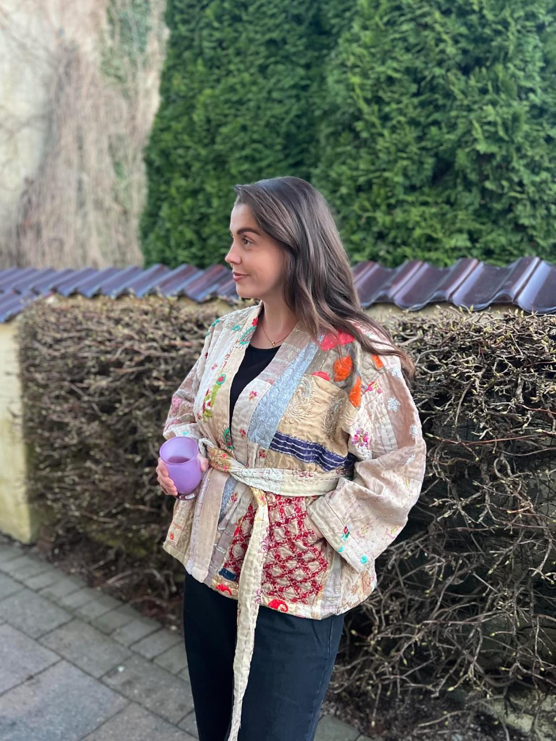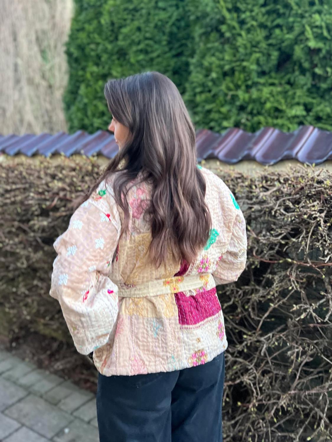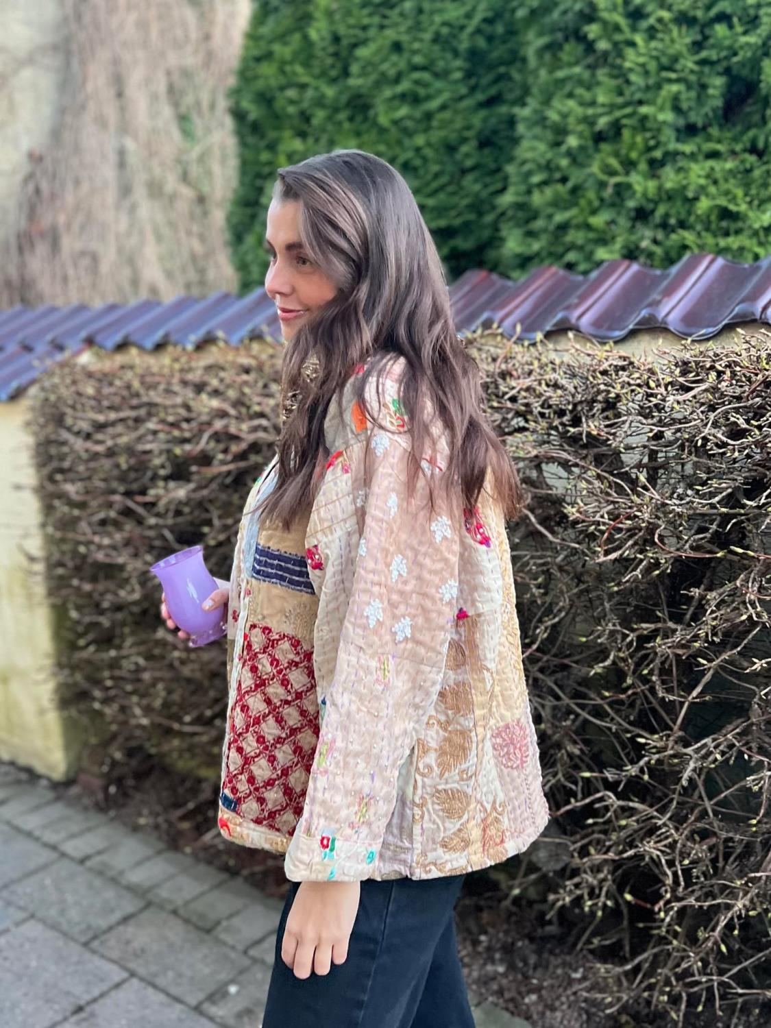 Den vakreste quiltede jakke fra vårt nye og unike merke Wauw. Jakken er åpen uten knapper, men har med et løst belte. Den har 2 påsydde lommer. Ermene er 3/4 lange. Jakka har de vakreste broderier, og den er er unik da ingen er like. Hver jakke er sydd sammen av vakre indiske stoffer.