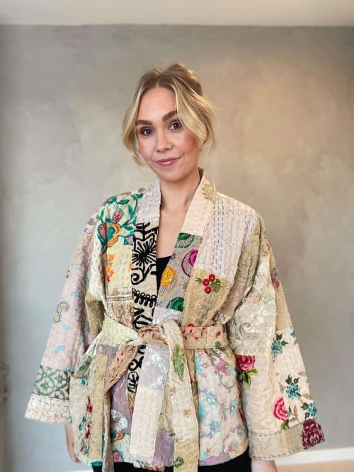 Den vakreste quiltede jakke fra vårt nye og unike merke Wauw. Jakken er åpen uten knapper, men har med et løst belte. Den har 2 påsydde lommer. Ermene er 3/4 lange. Jakka har de vakreste broderier, og den er er unik da ingen er like. Hver jakke er sydd sammen av vakre indiske stoffer.
