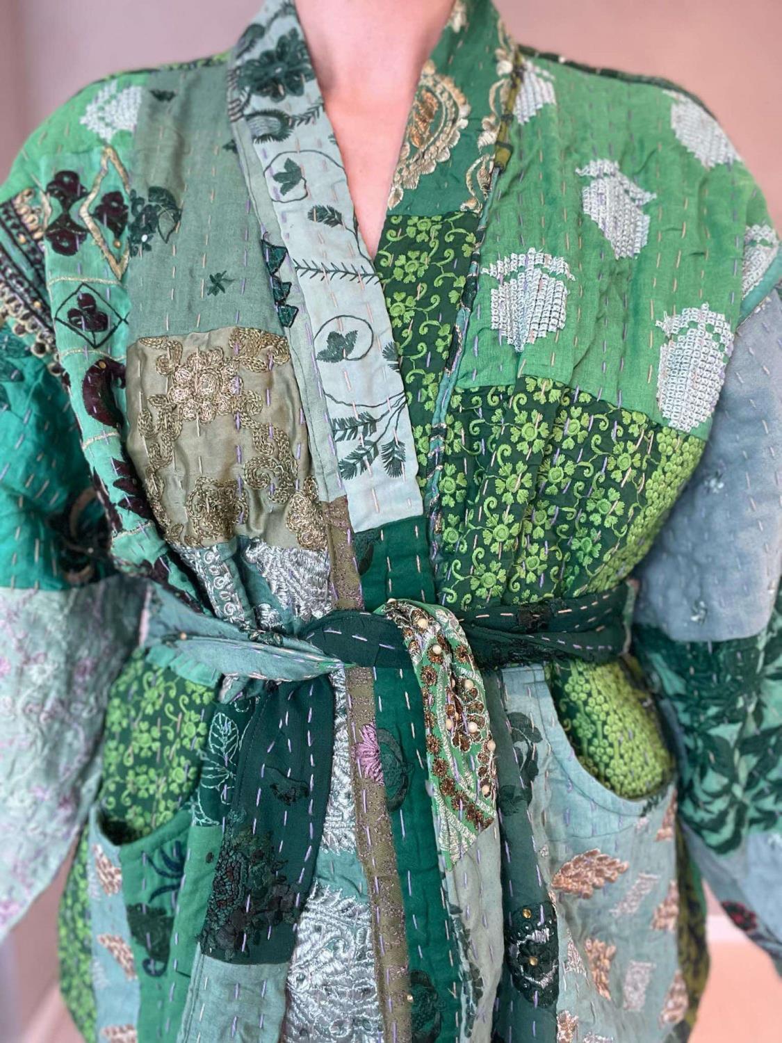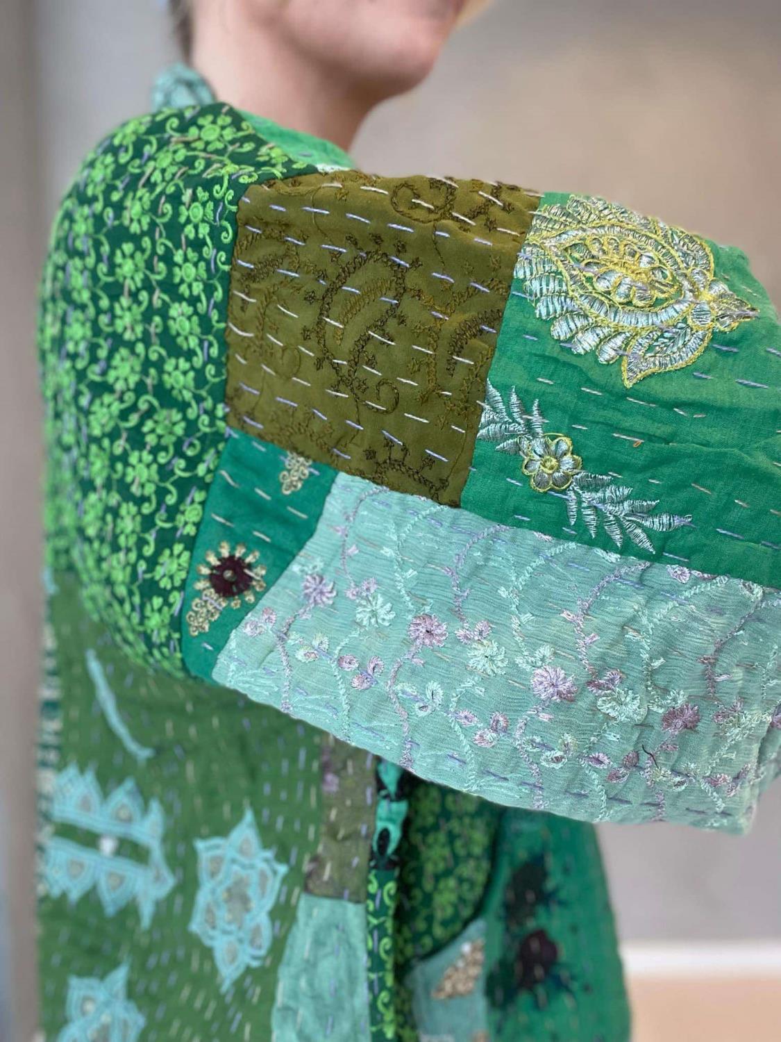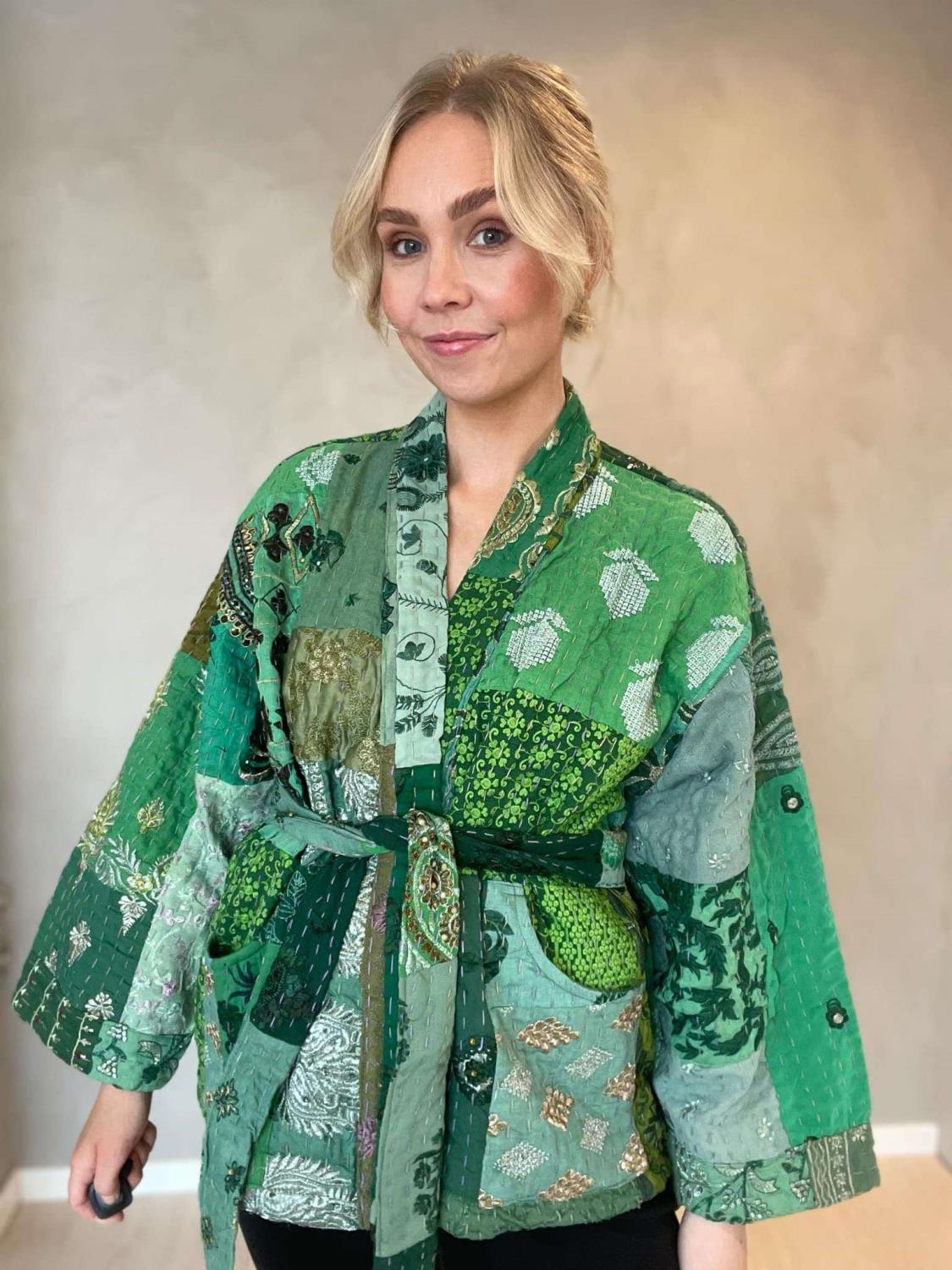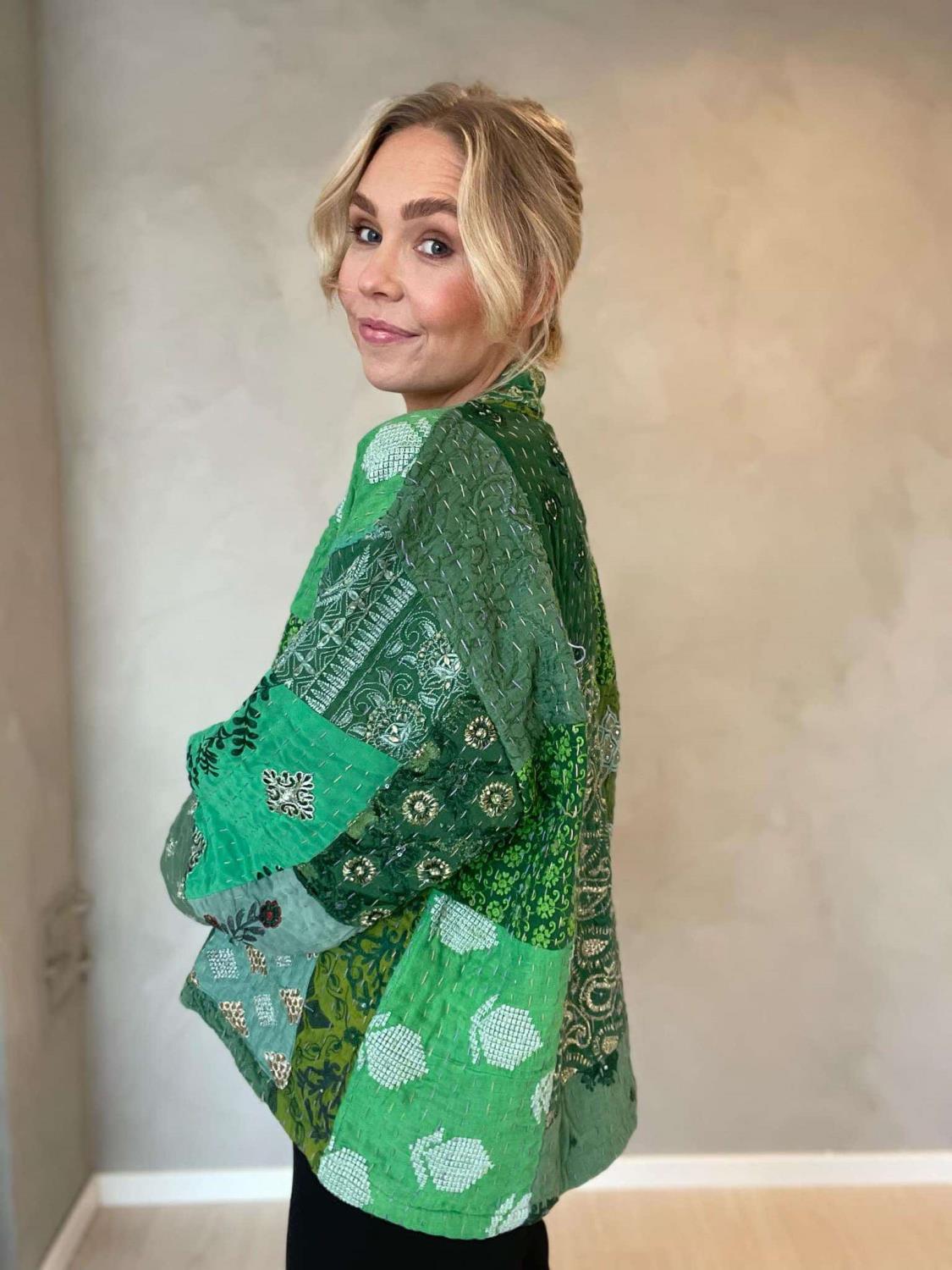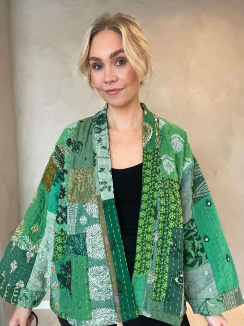 Den vakreste quiltede jakke fra vårt nye og unike merke Wauw. Jakken er åpen uten knapper, men har med et løst belte. Den har 2 påsydde lommer. Ermene er 3/4 lange. Jakka har de vakreste broderier, og den er er unik da ingen er like. Hver jakke er sydd sammen av vakre indiske stoffer.