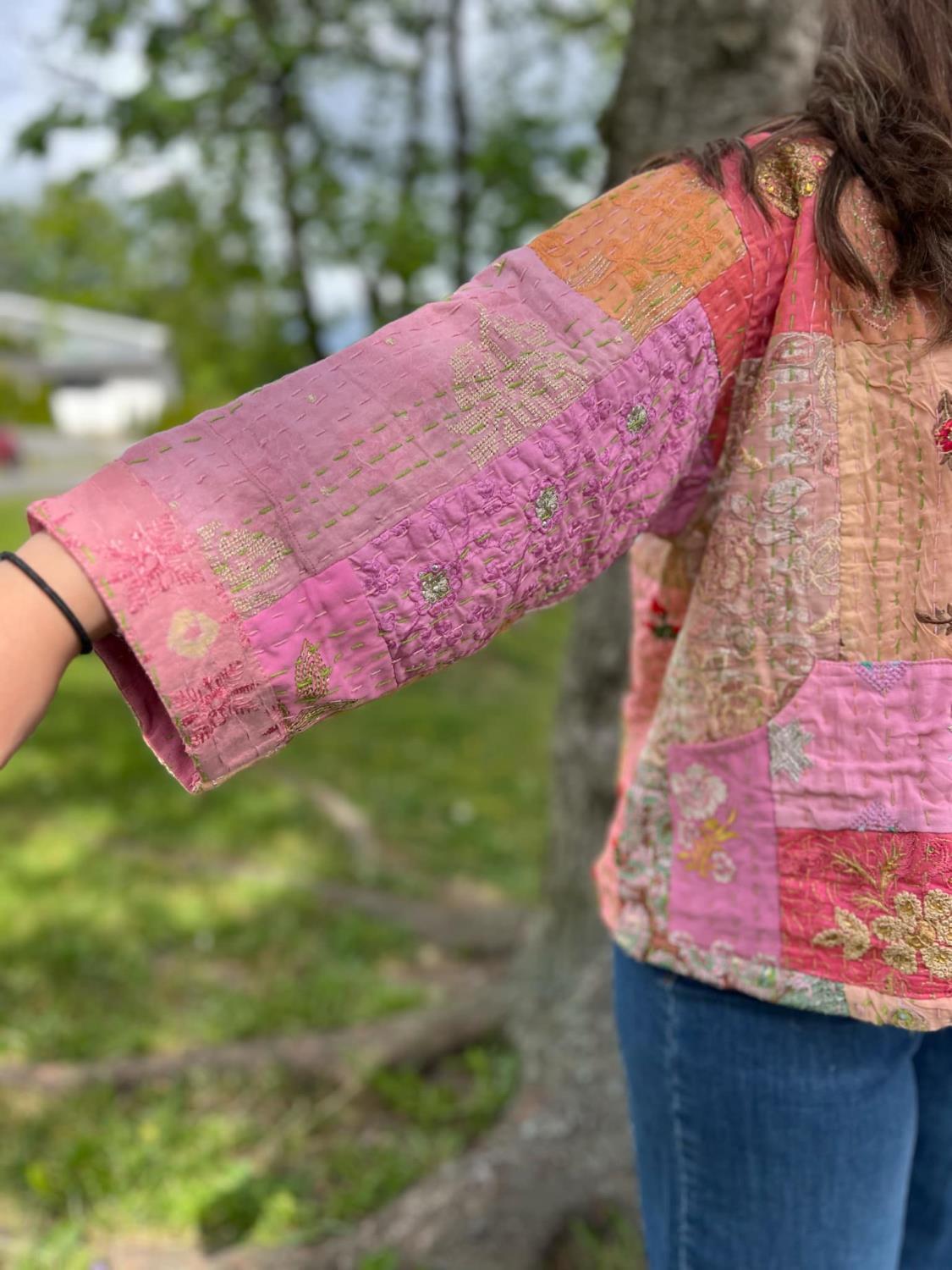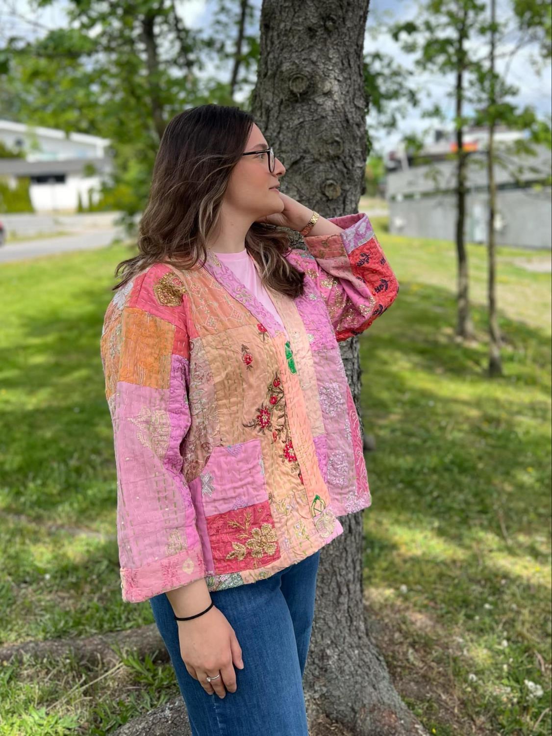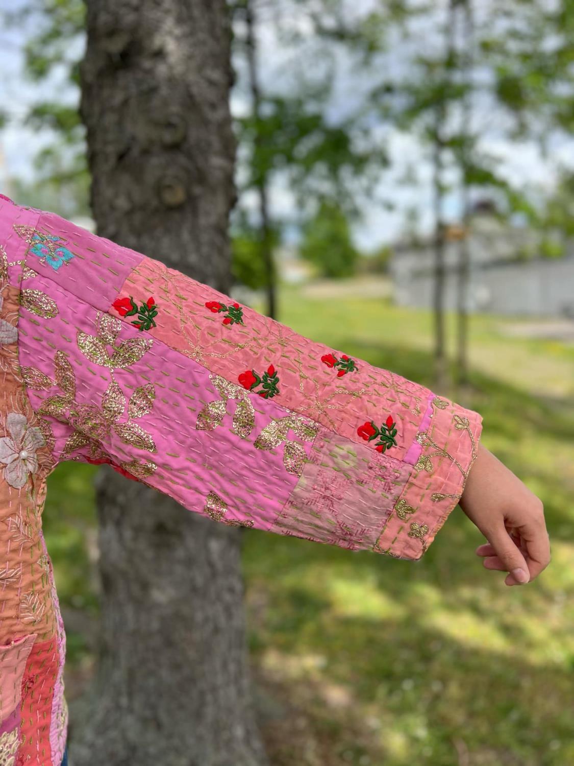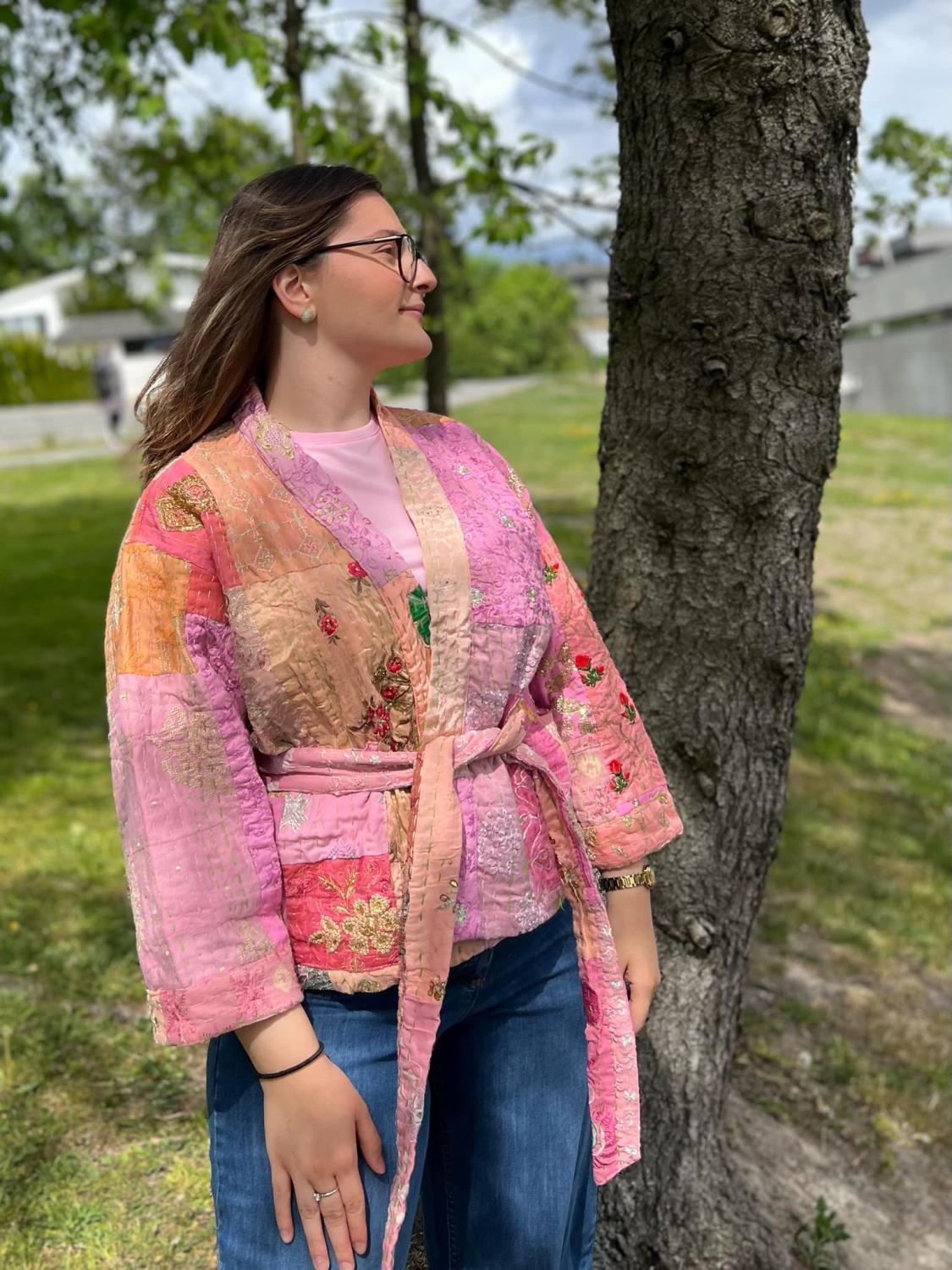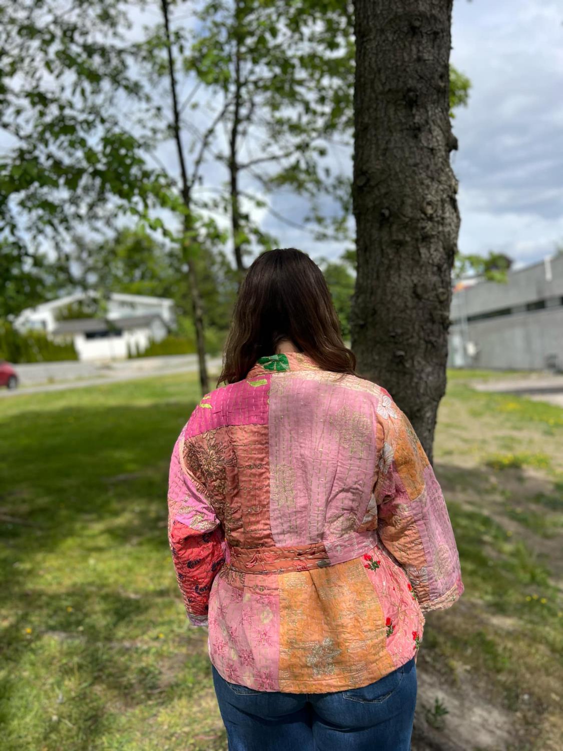 Den vakreste quiltede jakke fra vårt nye og unike merke Wauw. Jakken er åpen uten knapper, men har med et løst belte. Den har 2 påsydde lommer. Ermene er 3/4 lange. Jakka har de vakreste broderier, og den er er unik da ingen er like. Hver jakke er sydd sammen av vakre indiske stoffer.