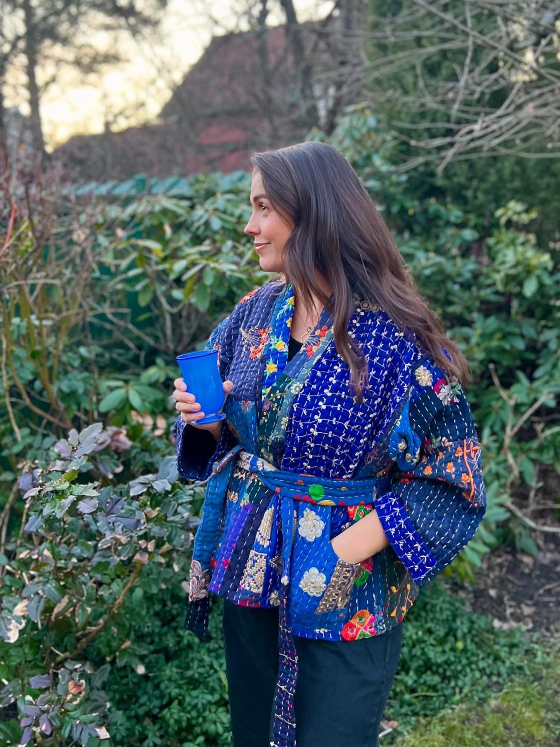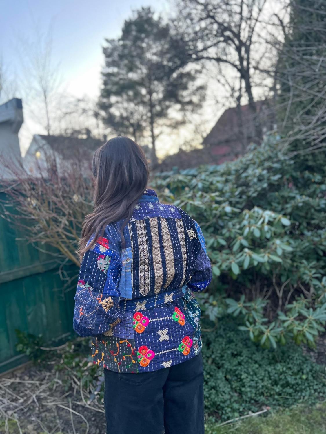 Den vakreste quiltede jakke fra vårt nye og unike merke Wauw. Jakken er åpen uten knapper, men har med et løst belte. Den har 2 påsydde lommer. Ermene er 3/4 lange. Jakka har de vakreste broderier, og den er er unik da ingen er like. Hver jakke er sydd sammen av vakre indiske stoffer.
