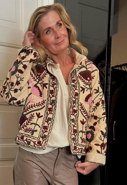Denne jakka kommer i et grovvevd bomullsstoff foret med et lett bomullsfor. Jakka har de lekreste broderier. Lommer i sidene.
