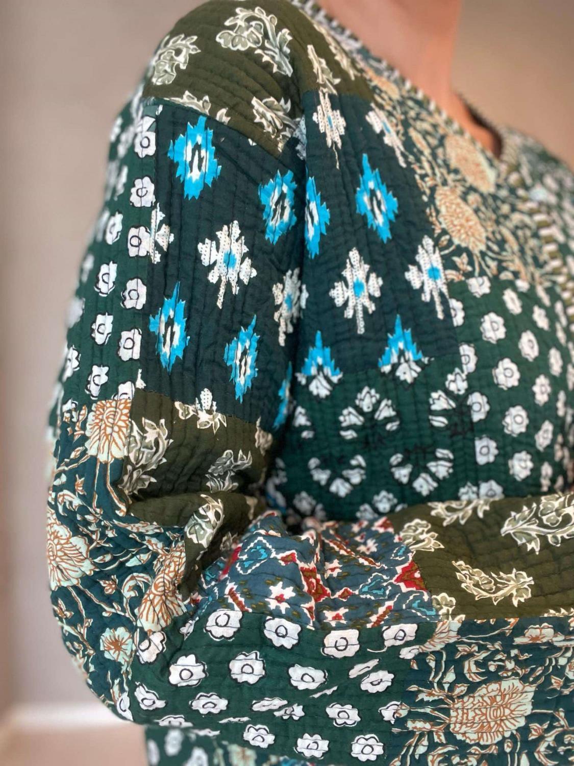 Jakken er i det skjønneste print og den er vendbar med striper på den andre siden. På siden med multiprint, har jakken stoff-knapper. På den stripete siden har den små runde treknapper. Ermerne er lange med splitter ved håndledd. På den multifarvede siden har jakken 2 frontlommer.