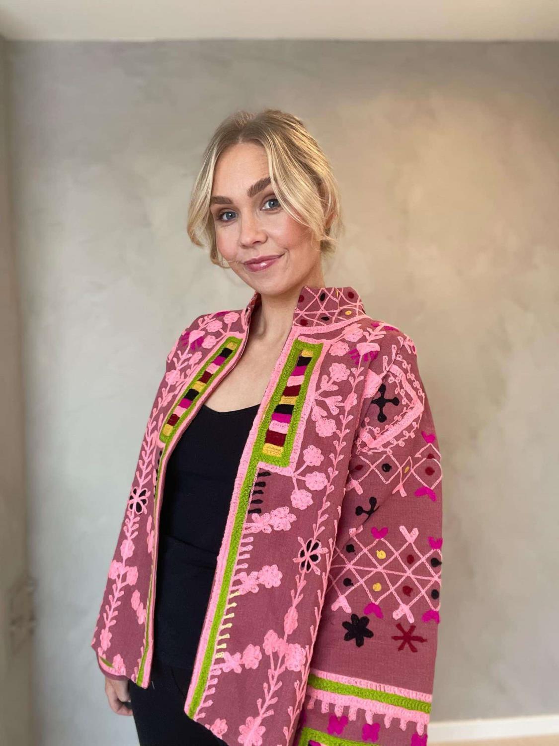 VAKKER jakke fra vårt nye og unike danske merke Wauw. Jakken har kinakrave og skrå sidelommer. Ermene er lange og jakken er i kraftig kanvas med vakkert broderi og kantbånd. Et kunstverk av en jakke i den nydeligste fargekombinasjon!