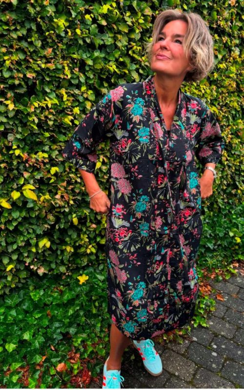 Vakker oversize kjole fra danske Wauw. Den har god vidd med splitt i sidene. 3/4 vide ermer. Denne er like fin som kjole som en tunika utenfor jeans. Herlig mønster du bare blir glad av!