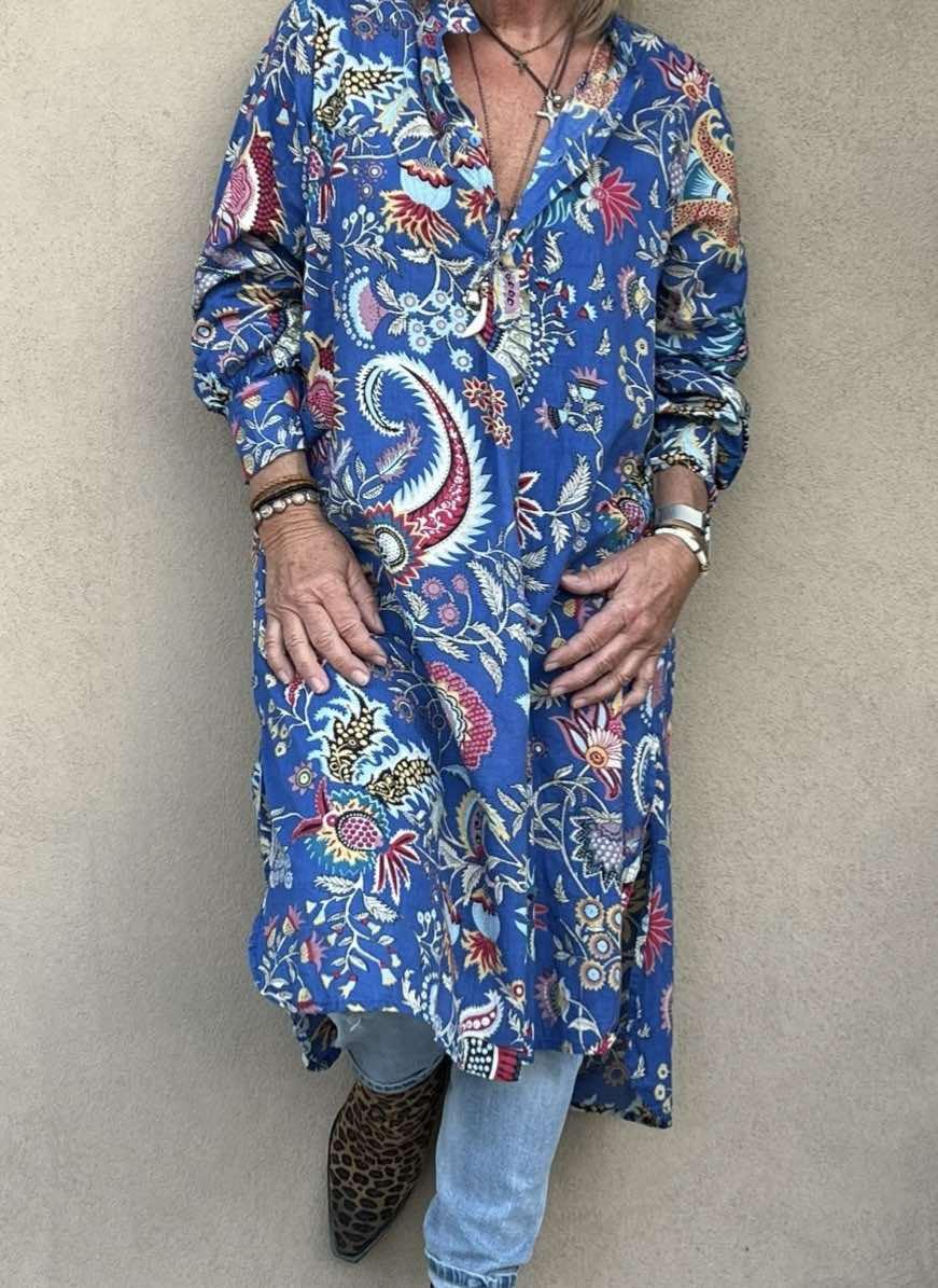 Vakker oversize skjortekjole fra danske Wauw. Den har god vidde, er litt lengre bak med splitt i sidene. Denne er like fin som kjole som en lang skjorte utenfor jeans. Herlig mønster du bare blir glad av!