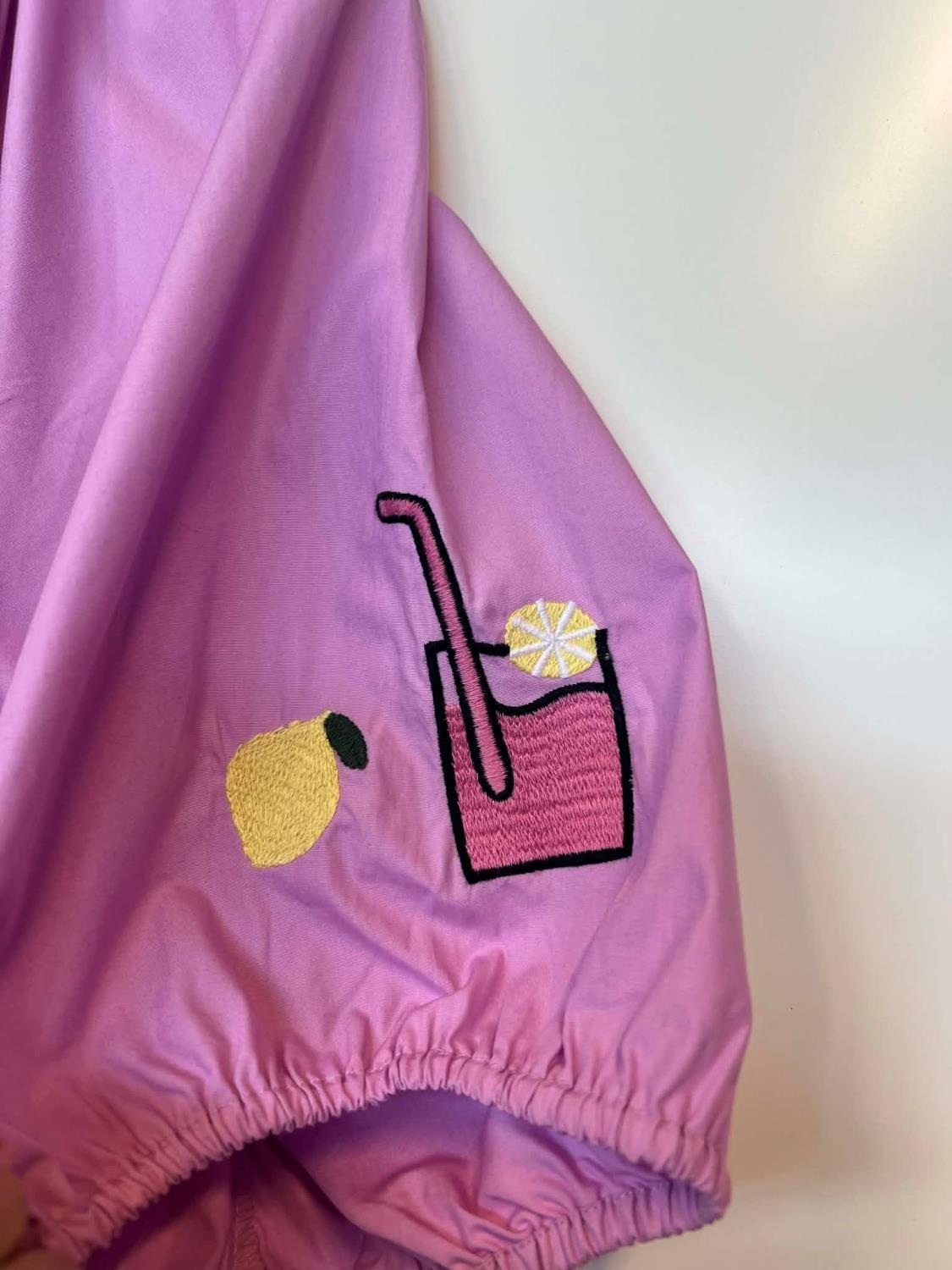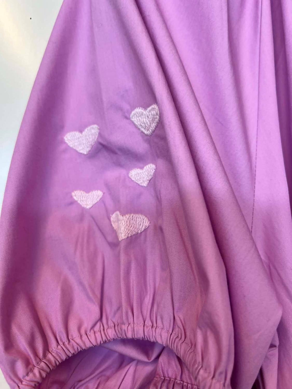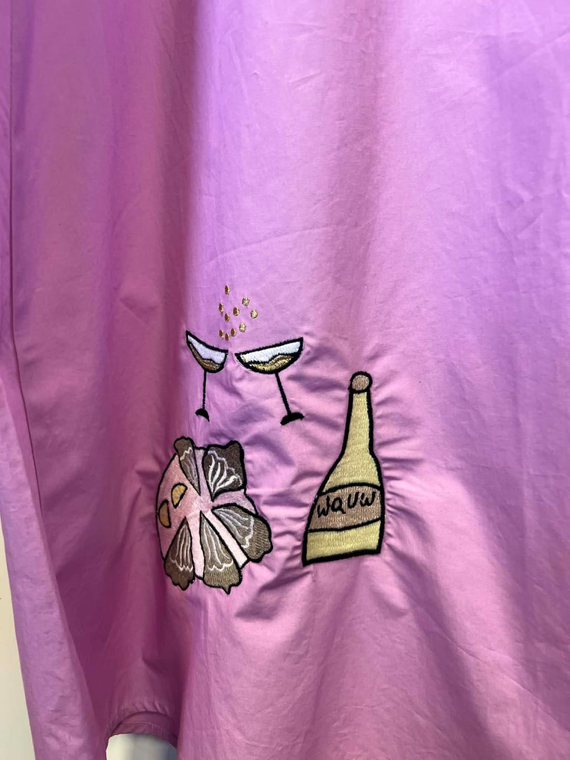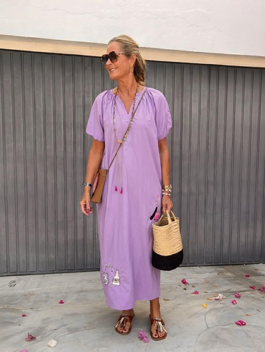 Korte ermer med broderier og strikk, nydelig hals og ankellang. Kjolen skrår fra brystet.