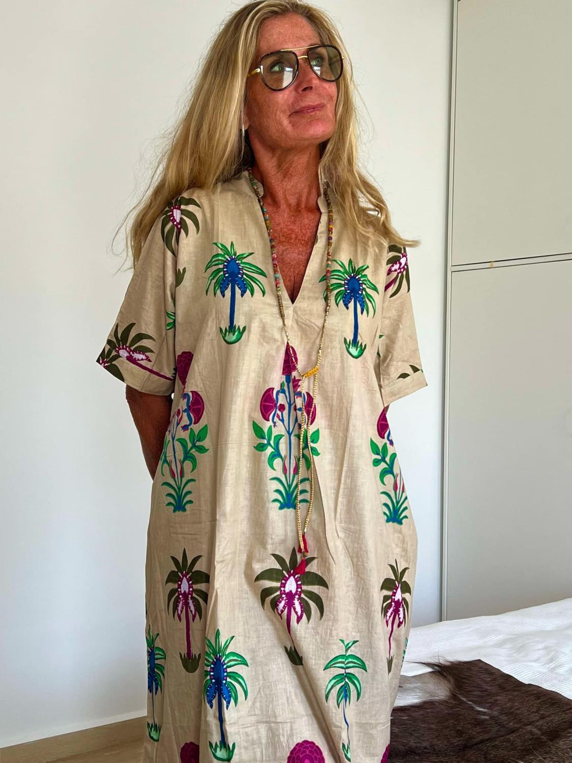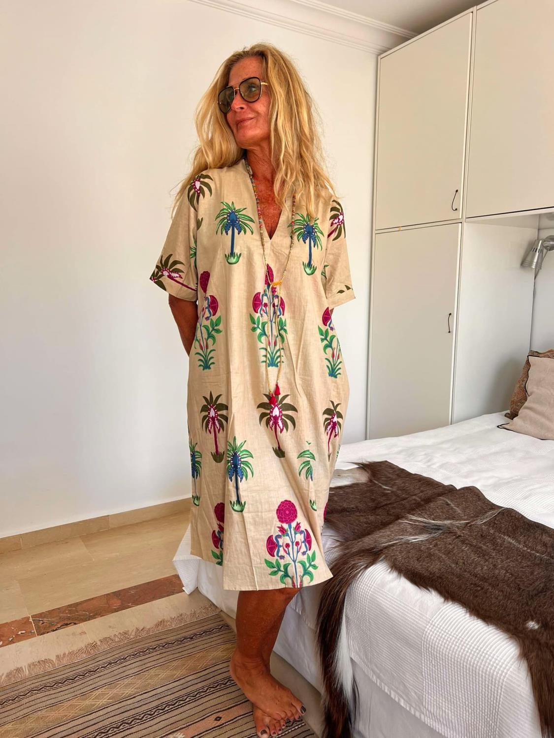 Nydelig kamelfarget bomullskjole fra Wauw! V- hals. korte ermer og lommer i siden. A-shape.